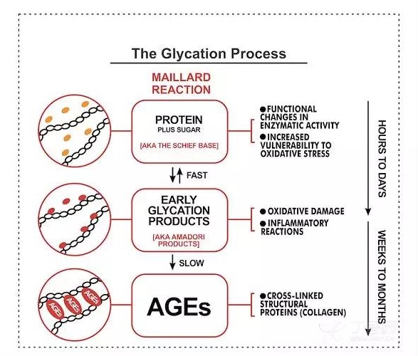 可能很多人對(duì)這一概念很陌生,但是大多數(shù)人都吃過(guò)含有糖基化終產(chǎn)物的食物,比如烤肉、糕點(diǎn)和炸肉等,經(jīng)過(guò)烘焙加工以后這些食物的表面產(chǎn)生了黑褐色的物質(zhì)。該反應(yīng)早在1912年就被法國(guó)化學(xué)家美拉德發(fā)現(xiàn),故又稱產(chǎn)生了“美拉德反應(yīng)”,發(fā)生美拉德反應(yīng)的食物有著誘人的香味和色澤,但該反應(yīng)同時(shí)可產(chǎn)生醛、雜環(huán)胺等有害的中間產(chǎn)物,導(dǎo)致蛋白質(zhì)的交聯(lián),生成晚期糖基化終末產(chǎn)物(AGEs)。