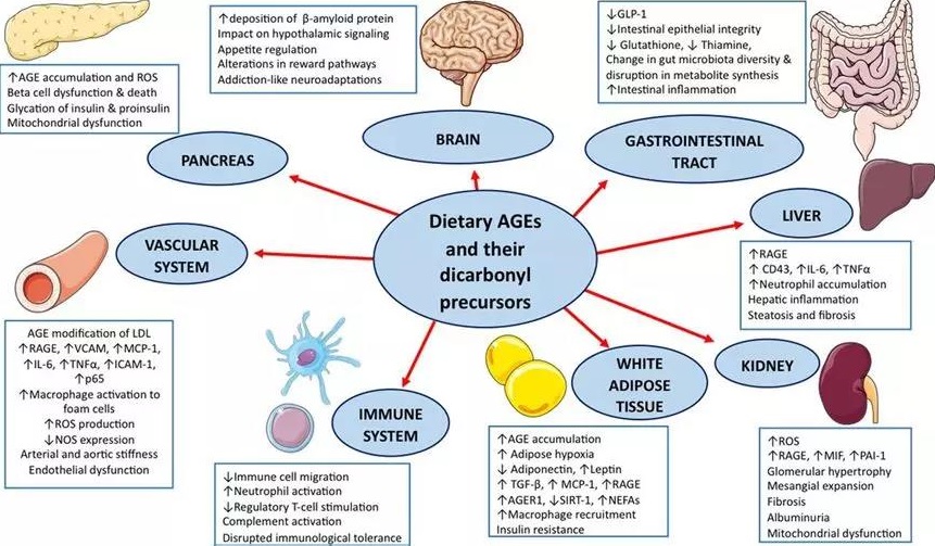 AGEs的來(lái)源分為外源性和內(nèi)源性兩種,外源性主要來(lái)自富含碳水化合物和含脂肪多的食物,攝入食物中的約有7%的AGEs會(huì)被人體吸收并堆積在人體內(nèi),根據(jù)烹飪方法的不同,同一種食物中AGEs的含量也有所不同,溫度越高食物中AGEs的含量越多。