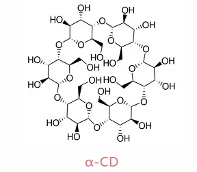 阿爾法環(huán)糊精(α-CD),分子式C36H60O30,分子量為972.84,為白色或類白色無定形或結(jié)晶性粉末,易溶于水和丙二醇,幾乎不溶于乙醇和二氯甲烷。α-CD是由6個葡萄糖單位經(jīng)α-1,4糖苷鍵連接成環(huán)形結(jié)構(gòu)的糊精,是葡萄糖基轉(zhuǎn)移酶作用于淀粉糖漿的產(chǎn)物。α-CD水溶解度在25℃為14.5g/100ml,應(yīng)用于要求環(huán)狀糊精溶解度較高的場合。由于α-CD的內(nèi)腔尺寸小于β-CD,更適合于包結(jié)小分子量的脂肪型客體(如聚乙二醇、多烯烴、脂肪酸等),使其更穩(wěn)定。
