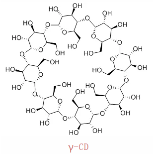 伽馬環(huán)糊精(γ-CD),是一種非還原性環(huán)狀糖類,由8個α-1,4糖苷鍵連接的D-吡喃葡萄糖單位環(huán)合而成。其分子式是C48H80O40,分子量為1297.12。呈白色結(jié)晶或結(jié)晶性粉末,無臭、味微甜,易溶于水,極難溶于乙醇。與α-CD、β-CD相比,γ-CD具有更大的疏水腔,更高的水溶性,能夠包埋分子量較大的客體分子(如類固醇、姜黃素等)來增加溶解度和穩(wěn)定性,因此具有很好的生物利用度。